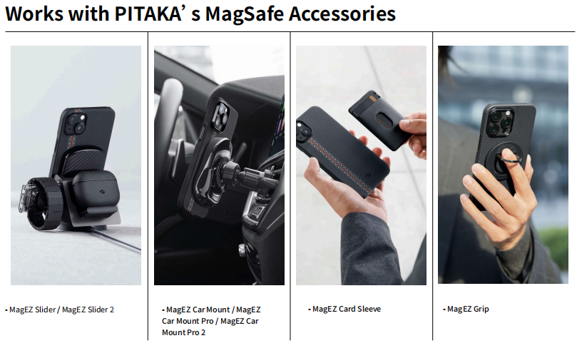 Es kann auch mit dem von PITAKA entwickelten Ökosystem -PitaFlow for Phones- zusammen verwendet werden, mit der MagSafe Ladestation [MagEZ Slider 2], MagSafe Autohalterung [MagEZ Car Mount Pro] und mehr.